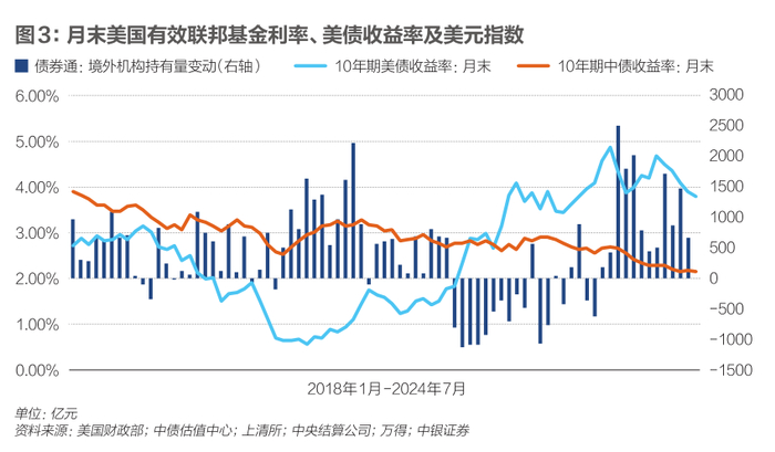 部分受中美正利差收敛甚至倒挂的影响,2022年2月至2023年8月,外资累计净减持境内人民币债券8926亿元。2023年9月起,部分受益于中美负利差收窄,外资重新净增持境内人民币债券,到2023年8月累计净增持1.35万亿元。2022年2月至2023年9月,10年期中美国债收益率为负相关0.488。其中,2022年2月至2023年8月为负相关0.216,2023年9月至2024年9月为正相关0.477(见图3)。由于外资在中国债券市场占比较低,不论外资持有量涨跌,没有影响中债价格总体上扬走势。2022年2月至2024年9月,上证国债指数累计上涨12.4%。