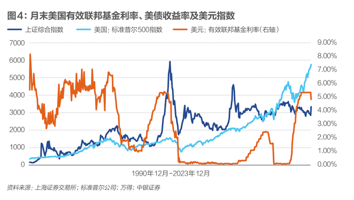 同债市一样,中国股市也更多受国内因素的影响,近年来表现尤为明显。2022年,受美联储追赶式加息、全球股债汇“三杀”的影响,A股也自2021年底冲高回落。全年,上证综指和标普500指数分别累计下跌15%和19%。2023年起,在美联储宽松和美国经济软着陆预期下,标普500指数持续反弹。同期,A股延续调整,直至2024年9月底一揽子金融支持政策出台,出现大幅反弹,彻底收复前期所有跌幅(见图4)。