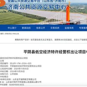 11月26日,济南公共资源交易中心官网发布了一则中标公告,平阴县低空经济特许经营权出让项目,由平阴县财政局控股的山东金宇通用航空有限公司中标,中标金额为9.24亿元。