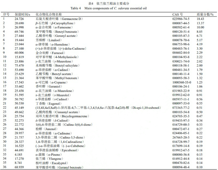 依兰精油的化学成分为主要有30余种,主要是酯类化合物、萜烯类化合物以及醇类和醚类化合物,包括苯甲酸甲酯、乙酸苄酯、大根香叶烯D、β-石竹烯、芳樟醇、香叶醇等,这些成分都具有良好的香气。