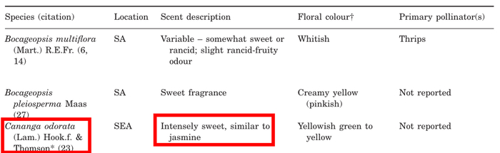 美国威德恩大学的研究者曾总结了番荔枝科植物的93种花香味道。其中,依兰香被描述为“强烈的甜味,类似于茉莉花”。也是因为这种味道和茉莉比较像,所以依兰又被称为“穷人的茉莉”。