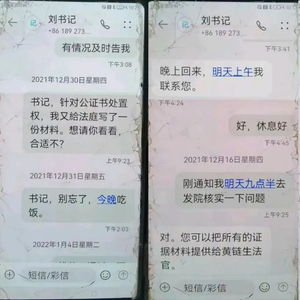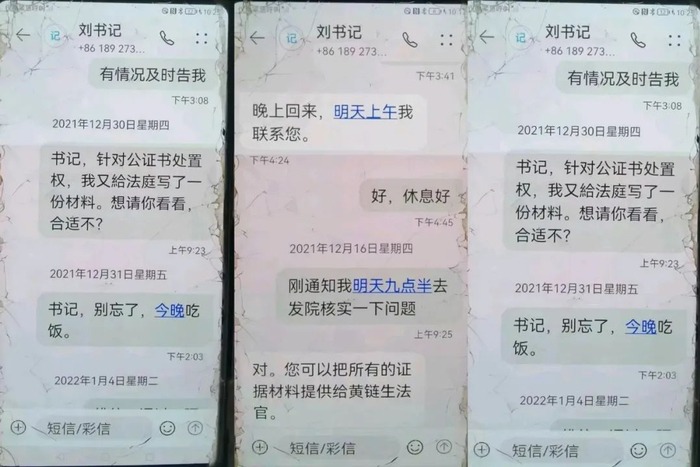 2021年12月30日,朱长利给刘伯辉发短信问道:“书记,针对公证书处置权,我又给法庭写了一份材料。想请你看看,合适不?”
