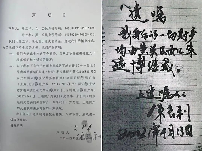 2020年,皮立华患病去世后,朱长利出示一份公证的“声明书”,称皮立华早在2014年就“自愿”将全部遗产交由朱长利继承处置。