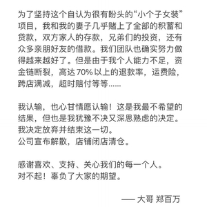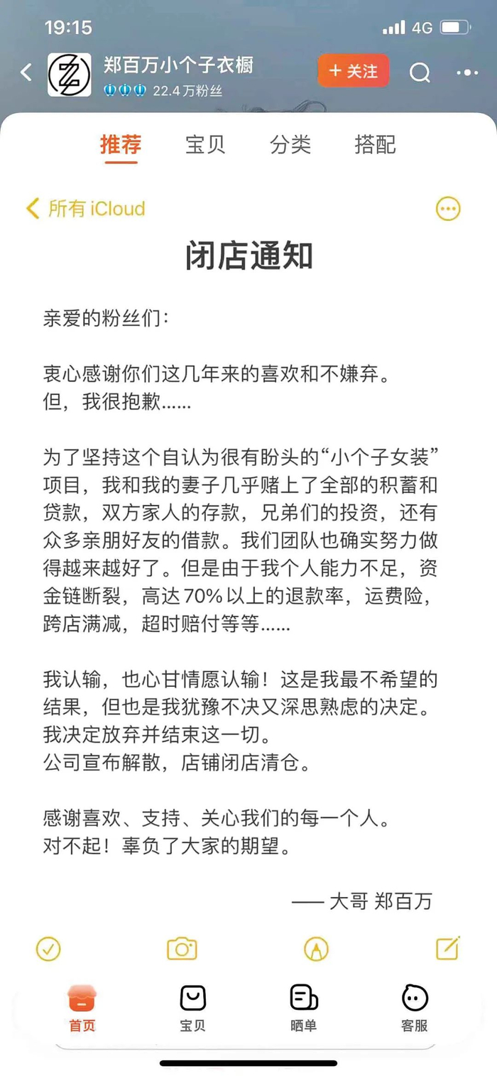纠结犹豫了半年多,经历了今年上半年的618,郑恩溢“感觉在服装这一块已经看不到希望了”。趁着淡季,郑恩溢就打算闭店,7月开始打包,整顿完毕后已经是10月。他在“郑百万小个子衣橱”店铺主页正式向22.4万粉丝发布闭店通知:“为了坚持这个自认为很有盼头的‘小个子女装’项目,我和我的妻子几乎赌上了全部的积蓄和贷款,双方家人的存款……但是由于我个人能力不足,资金链断裂,高达70%的退款率、运费险、跨店满减、超时赔付等等,只能选择关闭店铺。我认输,也心甘情愿认输!”