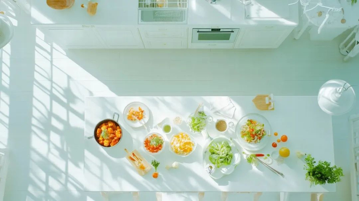 Prompt:Overhead view of A bright well lit white kitchen island covered with beautiful Chinese vegetarian food in an elegant traditional home setting. --chaos 15 --ar 16:9 --p--v 6.1