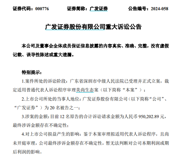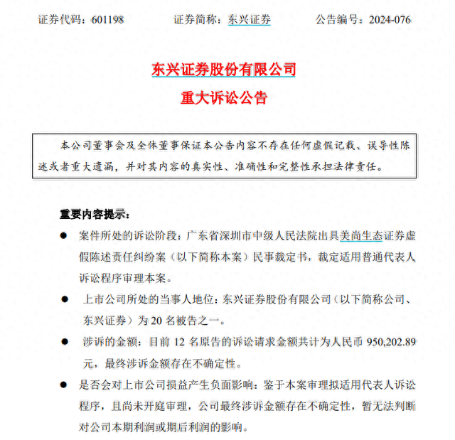 东兴证券、广发证券均表示,鉴于该案审理拟适用代表人诉讼程序,且尚未开庭审理,最终涉诉金额存在不确定性,暂无法判断对公司当期利润或期后利润的影响。同在12月16日晚间,已经退市的美尚生态也发布公告,对上述新增诉讼事项进行说明。