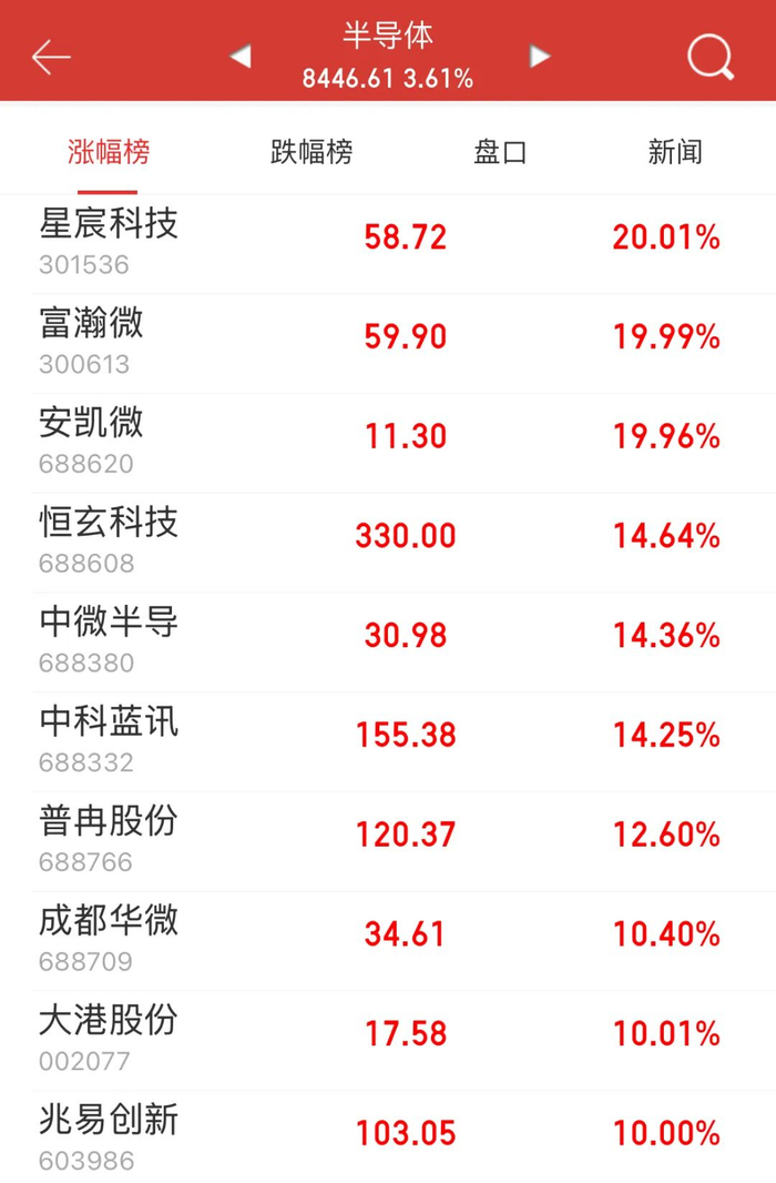 半导体板块临近午盘大幅拉升,截至收盘,板块指数大涨3.61%。星宸科技、富瀚微、安凯微20cm涨停,中微半导、中科蓝讯等多股涨超10%,大港股份、兆易创新涨停。