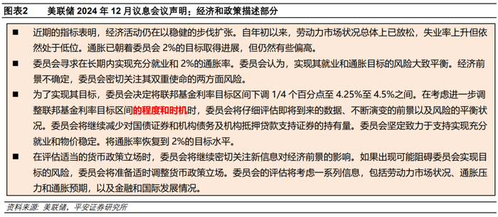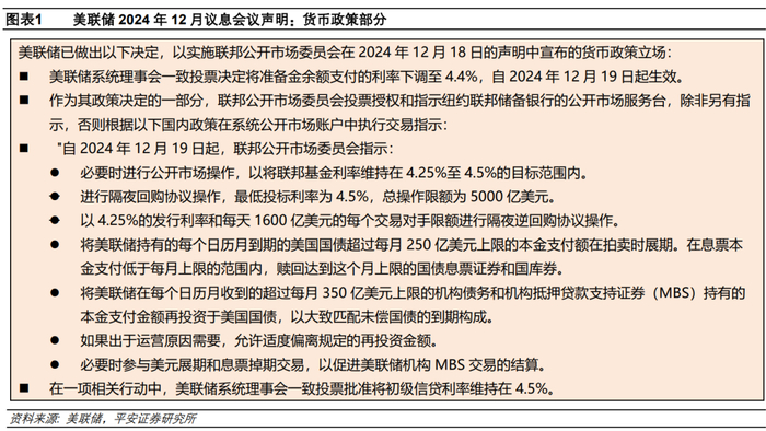 会议声明及经济预测:2025年仅降息2次。经济描述部分,12月会议声明较11月没有任何改动。政策方面,新增了“程度和时机”(the extent and timing),更加强调了美联储决策从“是否降息”转变为“何时降息”,为后续暂停降息做铺垫。经济预测方面,将2025年PCE和核心PCE通胀率分别上修0.4和0.3个百分点,均上修至2.5%;将2025年政策利率预测中值由3.4%上修至3.9%,将长期政策利率继续上修0.1个百分点至3.0%。点阵图中,有4位官员预计2024年末合理的政策利率是4.5-4.75%。