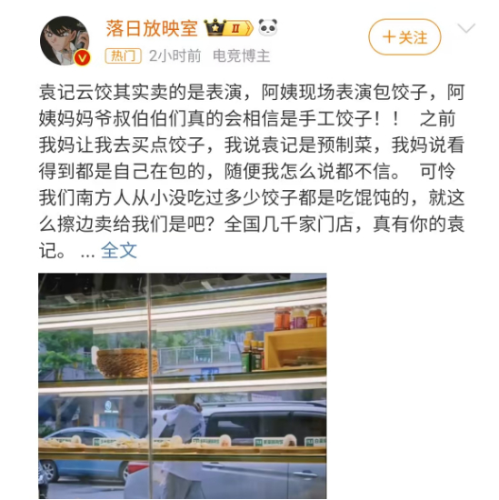 与此同时,还有网友揭露袁记云饺卖的是表演,阿姨现场表演包饺子,让人相信是手工水饺,其实是预制菜。