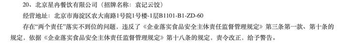 一同被通报的,还有另外两家招牌名为“袁记云饺”的门店,均存在“两个责任”落实不到位的问题。