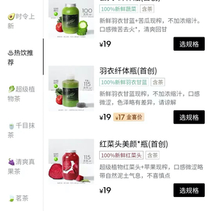 或许是看到了商机,喜茶之后将夺冠纤体瓶改为了常驻产品羽衣纤体瓶,接着还推出了以羽衣甘蓝和苦瓜为主角的去火纤体瓶、以红菜头为主角的红菜头美颜瓶、以羽衣甘蓝和黄瓜为主角的补水纤体瓶,12月还增加了羽衣甘蓝搭配牛油果的能量纤体瓶。