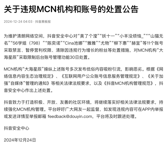 12月24日,抖音官方账号发布“关于违规MCN机构和账号的处置公告”: