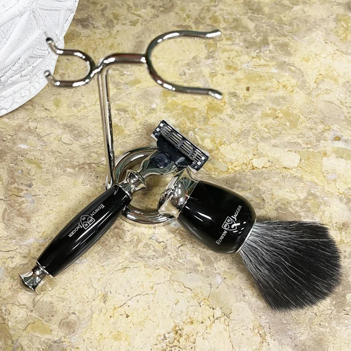 礼盒中包含了手动剃须刀(锋三刀片)、天然獾毛刷、刀架、剃须膏,以及一个黑色的手打泡沫陶瓷碗。一键式搞定wet shaving所需的工具,让型男们的每一次理容都有奢华精致的体验~