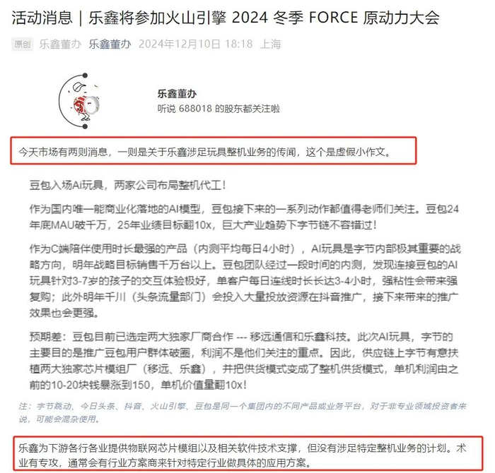 这种情绪恰逢大型语言模型(豆包)产业链/字节AI链全面发酵的背景,乐鑫科技是其中之一。对于使用字节跳动的AI玩具,乐鑫科技此前澄清,目前乐鑫科技并未涉足设备业务,但确实为其客户提供了物联网芯片模块和软件支持。