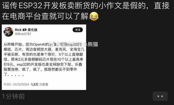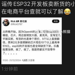 近日,OpenAI的一次直播疑似让乐鑫火了,外网传乐鑫ESP32模组、芯片、开发板等在某宝卖断货,有消息称乐鑫科技相关人士在线辟谣:小作文是假的,直接电商平台查就可以了解。
