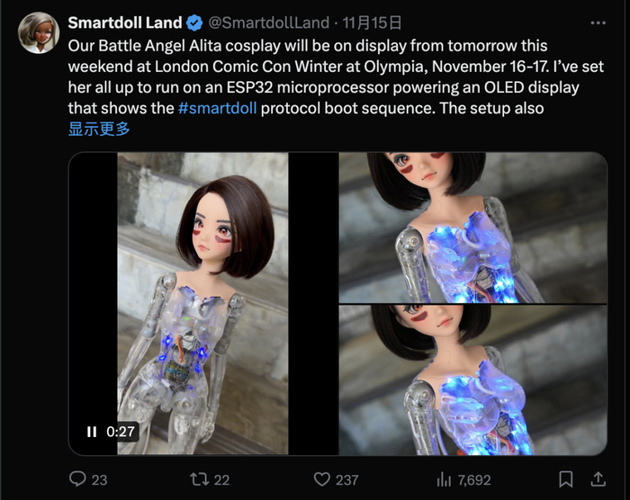可以看到市面上许多AI玩具项目采用ESP32,字节 AI 玩具 “显眼包” 使用乐鑫的芯片 ESP32,Folotoy 使用的 esptool 源自乐鑫,伦敦漫展上展示的智能娃娃(战斗天使阿丽塔)使用的是也是 ESP32。