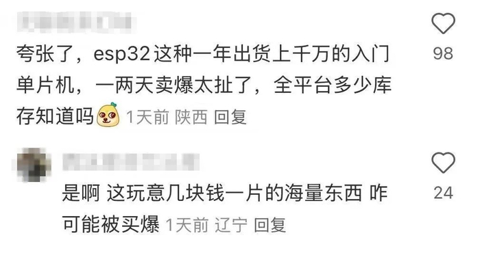 也有网友对谣言表示质疑,“这种芯片国内一搜一大堆”、“夸张了,这种全平台有海量库存的芯片,不可能一两天卖断”云云。
