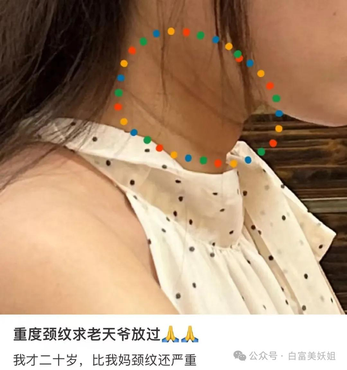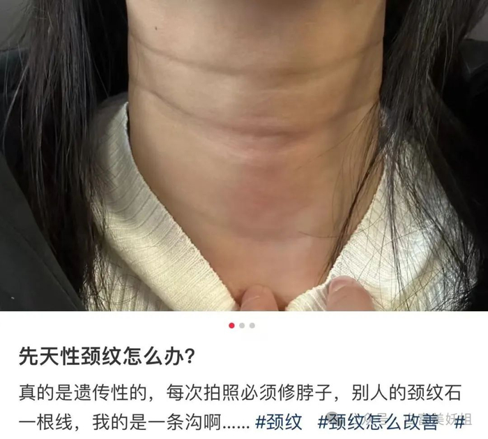 更扎心的是,这玩意儿不是老了才出现,有些20出头的年轻人,颈纹已经深的很夸张了,用化妆品也很难遮盖住。
