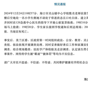 通报称,2024年12月24日18时57分,海口市灵山镇中心学校数名老师在放学后发现,学校一教学楼后空地处一名小学生倒地不动处于昏迷状态且口吐白沫,遂立即拨打120及110报警,并同时在120急救中心医生的指导下开展心脏复苏抢救。19时10分,120救护人员到达现场马上抢救;19时20分,学生家长接到学校通知后到达现场;20时05分,经120抢救无效,当场宣布死亡。