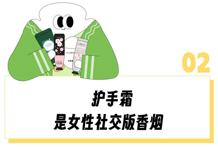 为了社交去抽烟怎么想都不划算,好在护手霜可以成为某种比香烟更高明的【社交工具】,当你想要两个女性熟起来,只需要一支护手霜。相同的味道,一样的体温,不臭还香对身体没有危害,护手霜社交既私密又体面。