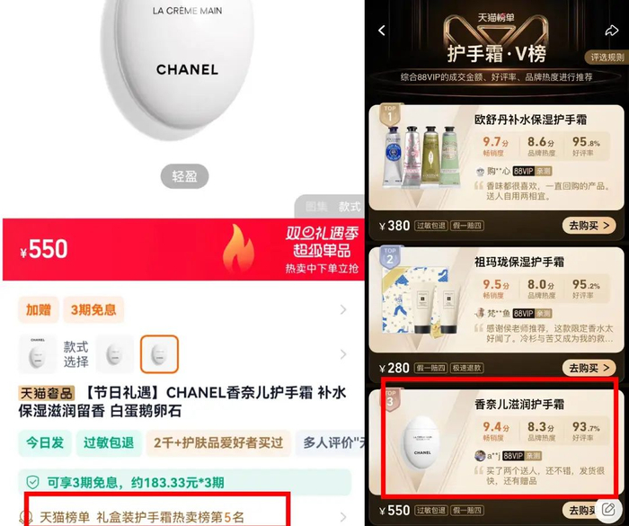 牌子要大,送礼成本要控制,花小钱买大面的【廉价奢侈品】套路屡试屡灵。比如前段时间登上12月天猫护手霜热卖榜前5名、天猫护手霜V榜第三的香奈儿鹅卵石护手霜。