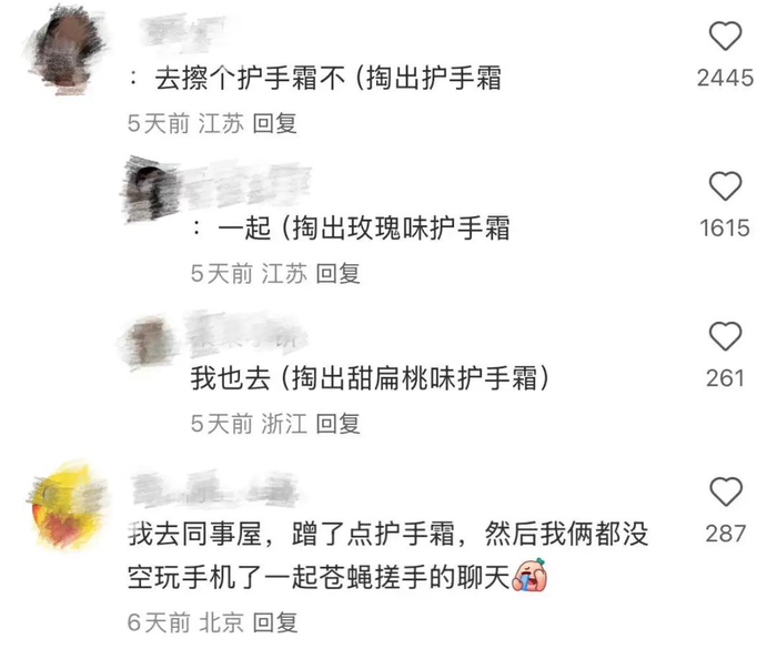 打工人和同事破冰靠一支护手霜,第一次共事就点奶茶显太亲密,但从兜里揣出来护手霜分享就不一样,“用不用”是破冰开始,到了“香不香”就能苍蝇搓手聊一下午。