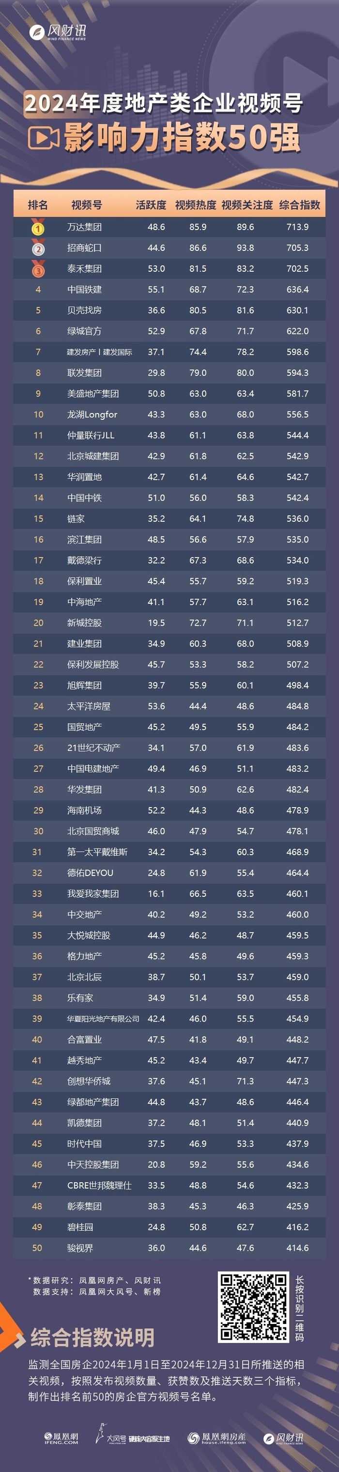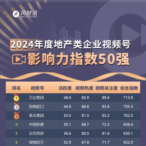 2025年1月3日,凤凰网房产联合风财讯发布《2024年度房企官方视频号运营报告》及系列榜单。该系列榜单跟踪2024年1月1日至12月31日,150余家房企官方视频号运营状况,以视频热度、账号活跃度、发布数量、获赞量等数据为基础,经过赋值进行指数系统化、层次化计算,以此充分展现房企视频号一年来的整体运营趋势。