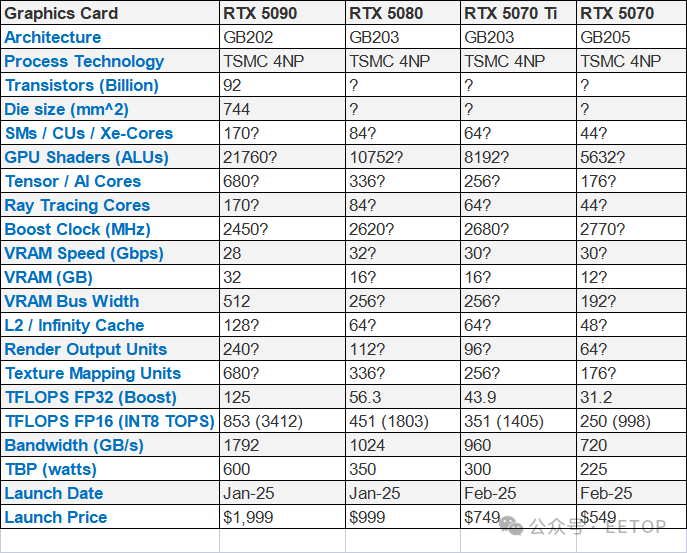 除了桌面GPU,英伟达还公布了移动产品线的名称。将有对应的RTX 5090、5080、5070 Ti和5070笔记本电脑,预计于2025年3月上市。虽然型号名称与桌面系列相匹配,但性能将显著降低,我们预计其他规格也会有所缩减。