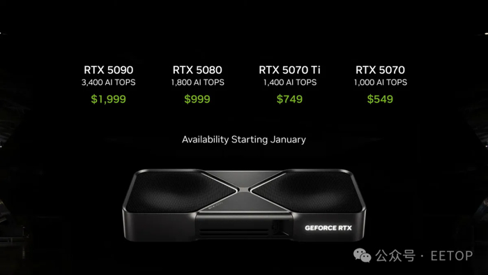 此次发布的50系列产品线还包括作为这一代旗舰产品的RTX 5090,售价高达1999美元,提供3400 AI TOPS的性能。RTX 5080则以更具吸引力的999美元价格,提供1800 TOPS的AI性能,略高于RTX 5090性能的一半,并继承了即将退市的RTX 4080 Super的价格。接下来是RTX 5070 Ti,售价749美元,提供1400 TOPS;最后是RTX 5070,以已提及的549美元价格,提供1000 TOPS。