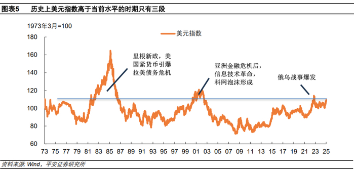 历史上,美元指数超过这一水平的时期只有三次(以1973年3月基期以来):1982-1986年美国紧货币引爆拉美债务危机时期,2000-2002年信息技术革命推动美国经济繁荣并走向科网泡沫时期,2022年俄乌点燃战火时期。