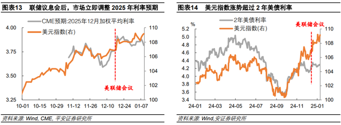 其次,“紧缩恐慌”的驱动逐渐弱化。美联储12月议息会议后,市场立即调整了2025年降息预期,由此前降息3次左右,调整至1-2次。去年12月下旬以来,CME市场利率预期保持稳定,2025年末加权平均利率稳定在3.8-3.9%,同时2年美债利率涨势降温,政策利率预期对美元指数的实质影响逐渐弱化。