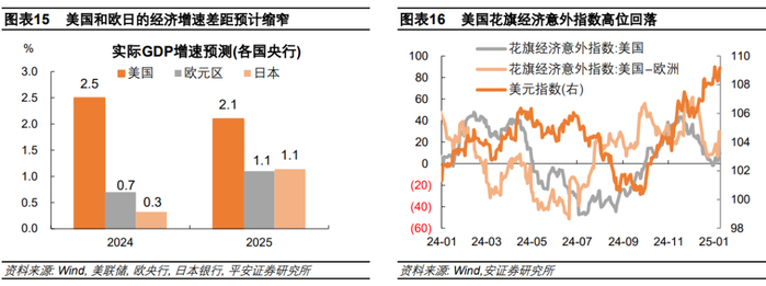 再次,欧日经济与美国经济的差距不宜高估。据最新美国、欧元区及日本央行的经济预测,2025年,欧元区和日本实际GDP增速均有望回升,美国GDP增速则更可能由高位回落,这意味着美国经济的“一枝独秀”程度不宜高估。美国花旗经济意外指数已由高位回落,欧洲与美国在这一指标上的差距也在缩小。总之,市场对欧日经济的担忧可能更多基于特朗普上台后的关税政策影响,而不主要出于欧日经济自身的症结,这意味着欧元和日元进一步走弱的内在驱动是可控的。