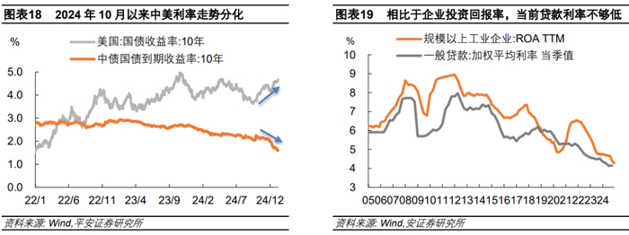 人民币汇率“以时间换空间”的根本依托是中国经济稳增长的实现。2024年10月以来,美债利率上行冲高与中债利率下行探底形成鲜明反差,美债主要反映美国再通胀和美联储转鹰的预期,中债则主要反映宽货币预期。从中国10年国债收益率与商业银行存款挂牌利率的关系推断,我们认为当前1.6%左右的10年国债收益率或已提前定价了2025年20bp以上的降息幅度。这一定价有其合理性:截至2024年三季度,金融机构一般贷款加权平均利率为4.15%,较2023年末下行20bp,下行幅度低于规模以上工业企业ROA(截至2024年11月为4.28%,较2023年末下行46bp)。因此,2025年降息势在必行,且幅度至少需要达到20bp以上,才能对冲前期企业盈利回落的影响,更好激发私人部门融资需求。基于此,当前要实现中债利率止跌回升,需要看到风险偏好的上行,也即市场对稳增长的信心明显增强。