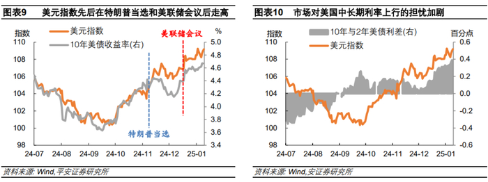 二是,美联储12月会议转“鹰”。2024年12月18日美联储议息会议是一个关键转折,引发了市场对美国中长期利率路径的重估。是次会议,美联储显著上修了未来1-2年的通胀和利率预期。更关键的是,美联储承认特朗普政策可能增加通胀上行风险,这与11月议息会议“短期内选举将不会对货币政策产生影响”的表态相异。10年与2年期美债利差走阔,较能反映出市场对中长期利率上行的担忧。美元指数在12月18日以后,基本站稳108上方。