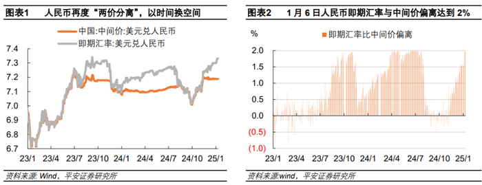 2025年1月3日之前,美元兑人民币即期汇率连续十个交易日收于7.299,即期汇率与中间价之间的偏离度稳定在1.5%,并未用足2%的涨跌幅限制,这是当时政策稳汇率意愿更强的体现(严守7.3关键点位)。1月3日下午,美元兑人民币即期汇率突现调整,3日和6日两天贬值约300点,6日收于7.33,并用足了相比中间价2%的跌幅空间。