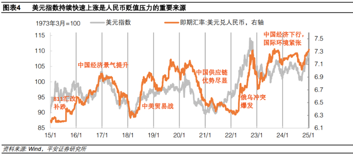 一、开年人民币汇率走贬。原因一:上年末稳汇率压力有所释放。2025年1月3日之前,美元兑人民币即期汇率连续十个交易日收于7.299,彰显政策稳汇率意图。1月3日下午开始,人民币汇率在两个交易日内贬值约300点,主要与去年末贬值压力释放不足有关。原因二:美元指数行至历史高位。特朗普当选以来,美元指数在“特朗普交易”浪潮中迭创新高, 1月2日美元指数最高达到109.24,历史上,美元指数超过这一水平的时期只有三次:1982-86年美国紧货币引爆拉美债务危机时期,2000-2002年信息技术革命推动美国经济繁荣并走向科网泡沫时期,2022年俄乌点燃战火时期。在美元大幅上涨过程中,人民币汇率寻求对美元保持稳定,使得人民币相对一篮子货币汇率明显升值。原因三:美中利差再创历史新高。2024年“9·26”中国一揽子增量政策释放宽货币信号以来,美国与中国10年期国债利差从1.58%攀升至3.06%。2022年4月美中利差转正后,其与美元兑人民币汇率之间呈现出显著的正相关性。美中利差不断走高强化企业和居民部门持汇意愿,供求关系仍压制人民币汇率。
