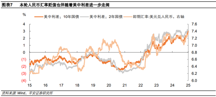 2015年人民币汇改到2022年4月以前,美中利差基本在负值区间运行,其与人民币对美元汇率之间的关系并不显著。2022年4月以来,美中利差转正,其与美元兑人民币汇率之间呈现出显著的正相关性,美中利差的变化开始更大程度地影响资金跨境流动的方向。2024年“9·26”中国一揽子增量政策释放宽货币信号以来,美国衰退交易逐步被证伪、并让位于再通胀交易,中美货币政策分化态势逐步凸显。美债利率上行走高与中债利率下行新低两相映照:2024年9月27日到2025年1月8日,美国与中国10年期国债利差从1.58%攀升至3.06%,2年期国债利差从2.15%升至3.2%。而这一时期正对应于美元兑人民币汇率的新一轮走贬。