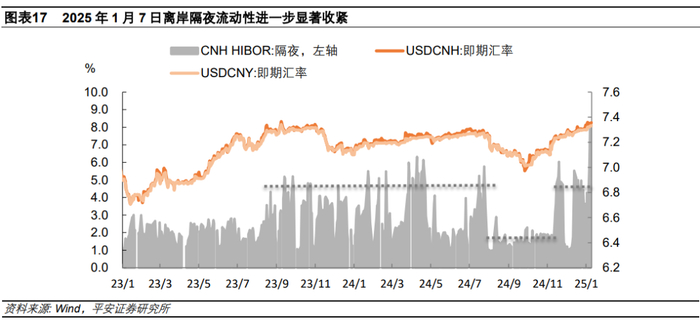 三、“稳汇率”仍是货币政策重心。一方面,人民币中间价一直保持在7.19以内,意味着在岸人民币即期汇率贬值的上限被控制在7.34以内。这是一种“以时间换空间”的做法,但会造成两个问题:一是,贬值预期持续存在,外汇市场“囤汇盘”大量积累;二是,人民币对一篮子货币汇率大幅升值,对出口有潜在不利影响。另一方面,离岸流动性明显收紧,提高离岸人民币做空成本。1月6日、7日,离岸隔夜Hibor渐次上升到了5.92%和8.1%,为2022年以来新高。央行宣布将在1月15日增发600亿央行票据,进一步回笼离岸人民币流动性。人民币汇率“以时间换空间”的根本依托是中国经济稳增长的实现。当前,市场期待2025年刺激内需政策能够前置、加量出台,进一步改善居民和企业部门信心,巩固和提升经济回升势头。通过更大力度的财政政策与货币宽松的协同配合,收窄美中利差,更有效地促进人民币汇率稳定。