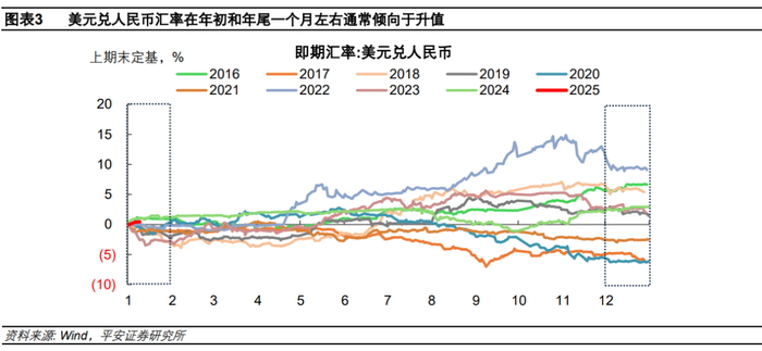 人民币汇率在年末、年初一个月左右存在一定季节性效应。2015年汇改以来,美元兑人民币汇率在大多数年份的首月和末月都是下降的(或主要与海外圣诞季强化中国贸易顺差、中国春节前外贸企业财务结算和发放奖金有关),特例是2016年和2024年的年初和年尾均呈现较大贬值压力。2025开年可能又是个特例,与去年末人民币对美元贬值压力释放不足有关。