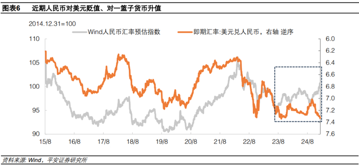 在美元指数大幅上涨过程中,人民币汇率寻求对美元保持稳定,使得人民币相对一篮子货币汇率出现明显升值。2023年8月初人民币中间价与即期汇率出现分离以来,截至2025年1月6日,人民币相对一篮子货币汇率(外汇交易中心发布的CFETS人民币汇率指数)累计升值了约4.7%,而人民币相对美元汇率则累计贬值了2.3%,二者从过去的同向关系变为反向相关。人民币对一篮子货币的权重构成决定了,只要在美元走强背景下,人民币相对美元少贬,就一定会呈现出人民币对美元贬值、对一篮子货币升值的情况。