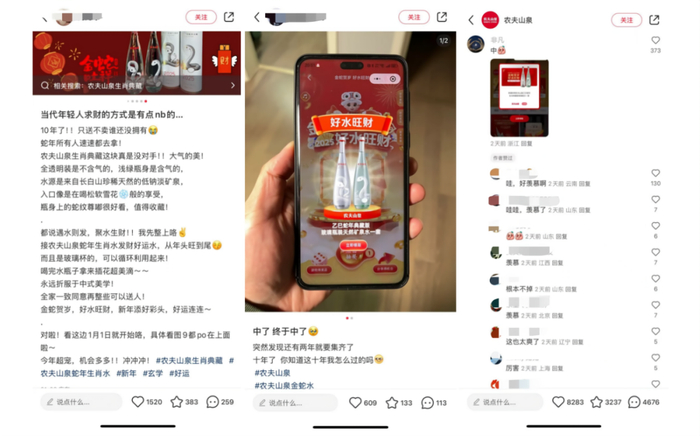 在春节之际,生肖水只送不卖,实际上是折射了水在中国传统文化里为“财源滚滚”的象征,新春送水寓意“遇水则发”。如果在活动中抽取到生肖水,也意味获得了“好水旺财”的彩头。一方面,生肖水系列其实已经脱离了单纯的商品范畴,演变成农夫山泉回馈消费者的一种品牌专属仪式。