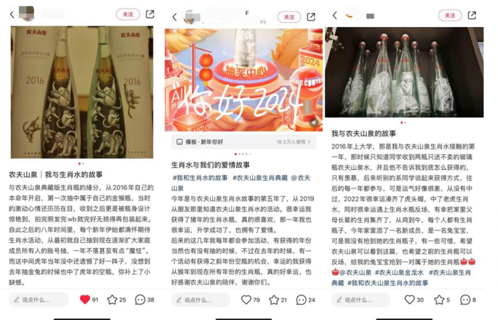 一直以来,因为成功将传统文化与“限定纪念”完美融合,农夫山泉生肖水的稀缺性与收藏性一直都居高不下。在农夫山泉在各大平台的官方号的评论区,更是被无数人留言希望可以获得生肖水收藏。
