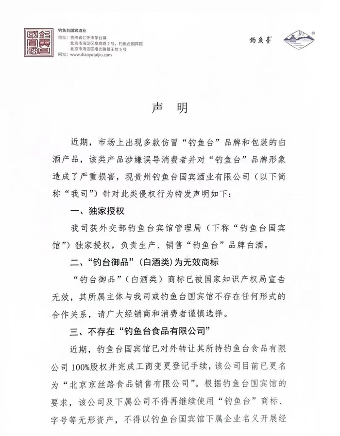 2024年9月19日,钓鱼台酒业发布声明表示,“钓台御品”(白酒类)商标已被国家知识产权局宣告无效,“钓鱼台食品有限公司”已更名为“北京京丝路食品销售有限公司”,其所属主体与钓鱼台酒或钓鱼台国宾馆不存在任何形式的合作关系,不得再继续使用“钓鱼台”商标、字号等无形资产。