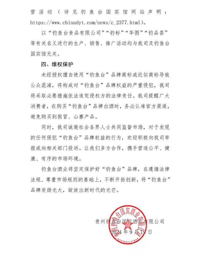 2024年5月27日,钓鱼台酒业发文称已成立维权专项小组,在全国范围内开展巡查工作,并在山东、广东、福建、江苏、湖南、四川等多地成功清理了60余家侵权店铺。