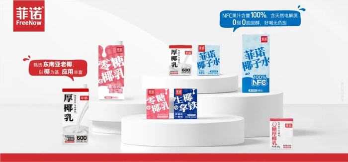 在2015年~2020年期间,围绕着“椰子”元素菲诺率先在国内推出冷藏水果果冻——菲诺椰子冻、短保冷藏鲜榨椰汁——菲诺百利包椰汁以及新椰汁、零糖椰汁、冷冻生椰乳、冷冻椰子水等一系列单品。