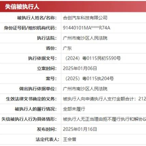中国执行信息公开网显示,1月16日,合创汽车科技有限公司因被执行人无正当理由拒不履行执行和解协议,被广州市南沙区人民法院列为失信被执行人,涉及服务合同纠纷案件,履行情况为全部未履行。生效法律文书确定的义务显示,被执行人向申请执行人支付金额合计2120556元。