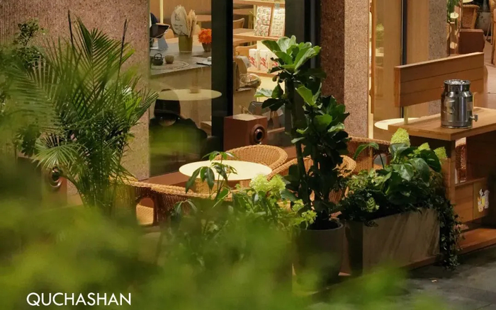 去茶山紧扣侗族、苗族的民族特色展开命题作文,设计元素融入两个民族的传统图案、色彩以及手工艺品,桌椅大多竹制,各个角落摆放着绿植,铺陈出贵州多元地貌间世所罕见的闲适风情。