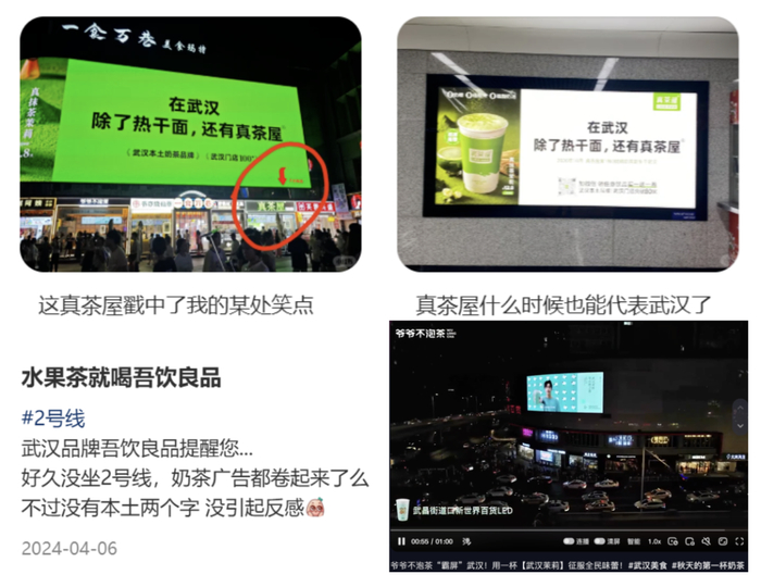 武汉这个地方情况太复杂了。爷爷不泡茶一度把“武汉茉莉”四个大字贴满地铁站,“一杯以城市命名的鲜奶茶”情怀激荡;本地同行真茶屋更是放出豪言:“在武汉,除了热干面,还有真茶屋”,把游客的打卡心理摸得透透的。