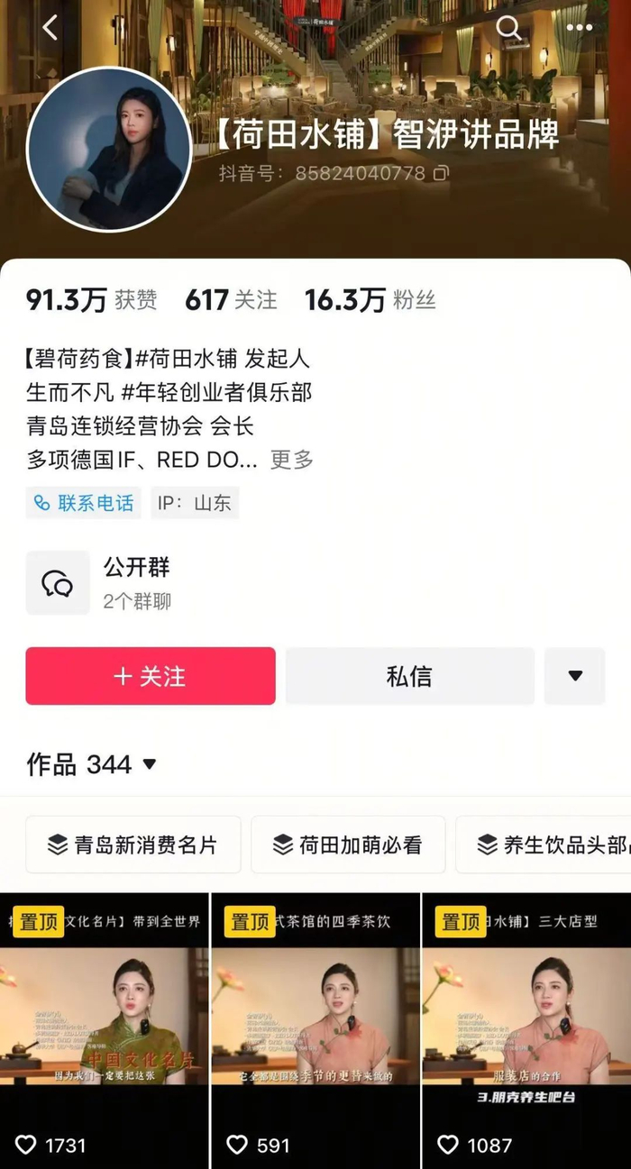 青岛品牌“荷田水铺”的创始人金智洢就在抖音上运营着一个16万粉丝的个人账号,又是讲“药食同源”又是讲装修理念。她接受红餐网采访时表示,个人IP对品牌的招商加盟也起到了不小的作用,很多创业者通过她的账号对荷田水铺产生了兴趣,直接通过短视频账号咨询加盟业务。