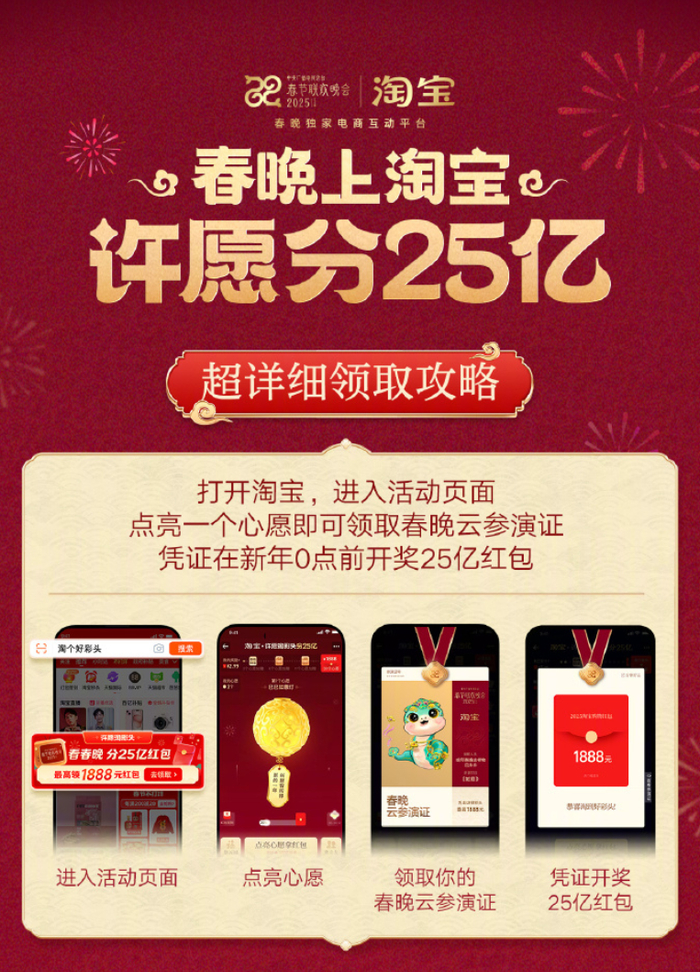 今年,借着与春晚合作的契机,淘宝打出了“春节上淘宝,许愿分25亿”的口号,号召用户在站内搜索【淘个好彩头】,参与心愿互动活动,领取专属的“春晚云参演证”,即可在除夕当晚凭证参与25亿红包瓜分活动。其中,25亿元红包瓜分活动登上春晚节目《如意》,舞台背景实时展示用户心愿,形成“全民共创”的沉浸式体验。